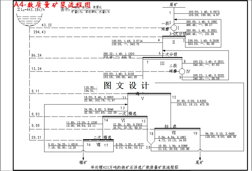 本设计是针对某式磁铁矿矿石的初步设计,设计年处理量为425万吨的铁矿选矿厂,设计阶段为初步设计。设计以大孤山选矿厂的矿石特性、选矿试验研究结果、可行性研究报告及处理同类矿石选矿厂生产实践等为依据。设计主要内容包括说明书和图纸两大部分。说明书部分主要包括工艺流程的确定与计算,主要设备的选择等。设计的生产工艺为中碎带预先筛分的三段一闭路破碎-阶段磨矿-单一磁选-细筛再磨工艺流程。本设计的技术经济指标为:原矿品位27.50%,精矿品位67.50%,尾矿品位8.87%,金属回收率78.00%。所选用设备的工艺技术上先进,经济上合理,生产上可靠,具有较高的技术经济指标。图纸部分主要绘制了中细碎车间、主厂房、选别车间的平断面和设备形象联系图及数质量矿浆流程图等。