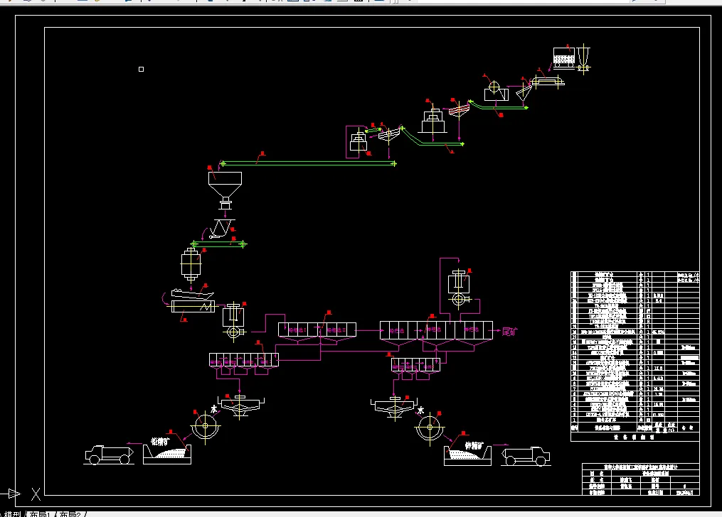 对设计工艺流程进行了工艺指标计算,包括破碎、筛分、磨矿、浮选和矿浆流程。对破碎、筛分、磨矿、分级、浮选及脱水设备进行了选择和计算,确定了工艺所需的工艺设备。