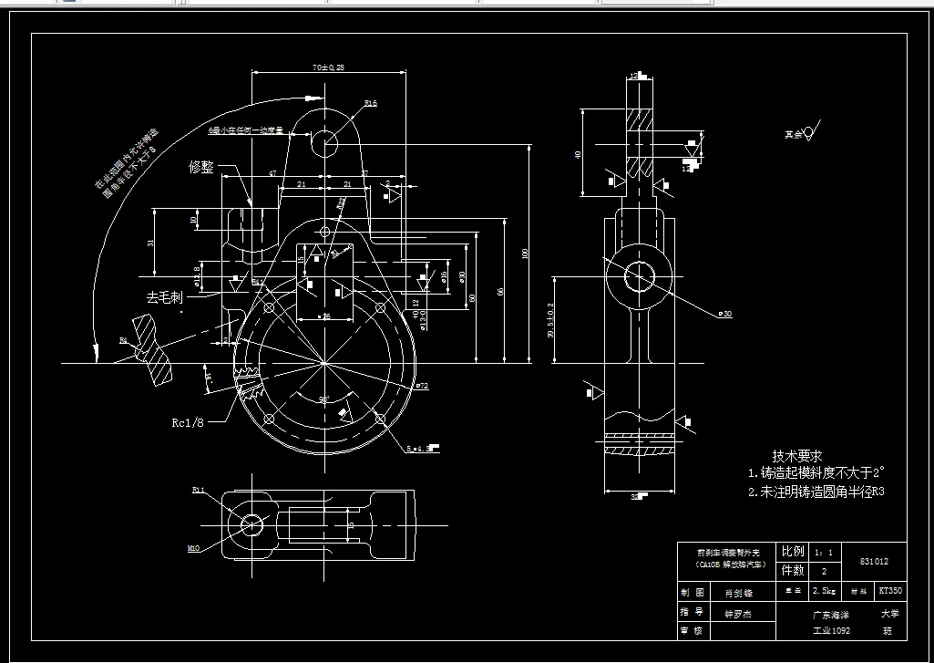 轴承盖加工工艺规程及钻孔的夹具设计是包括零件加工的工艺设计、工序设计以及专用夹具的设计三部分。在工艺设计中要首先对零件进行分析,了解零件的工艺再设计出毛坯的结构,并选择好零件的加工基准,设计出零件的工艺路线;接着对零件各个工步的工序进行尺寸计算,关键是决定出各个工序的工艺装备及切削用量;然后进行专用夹具的设计,选择设计出夹具的各个组成部件,如定位元件、夹紧元件、引导元件、夹具体与机床的连接部件以及其它部件;计算出夹具定位时产生的定位误差,分析夹具结构的合理性与不足之处,并在以后设计中注意改进。