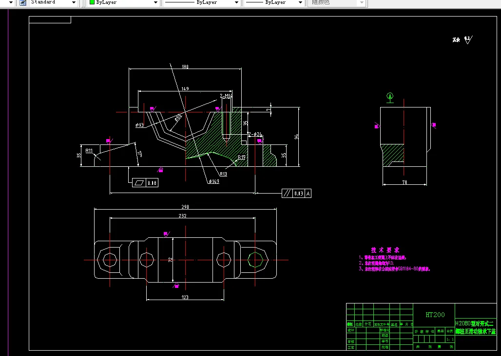 H2100型对开式二螺柱正滑动轴承零件加工工艺及夹具设计是包括零件加工的工艺设计、工序设计以及专用夹具的设计三部分。在工艺设计中要首先对零件进行分析,了解零件的工艺再设计出毛坯的结构,并选择好零件的加工基准,设计出零件的工艺路线;接着对零件各个工步的工序进行尺寸计算,关键是决定出各个工序的工艺装备及切削用量;然后进行专用夹具的设计,选择设计出夹具的各个组成部件,如定位元件、夹紧元件、引导元件、夹具体与机床的连接部件以及其它部件;计算出夹具定位时产生的定位误差,分析夹具结构的合理性与不足之处,并在以后设计中注意改进。