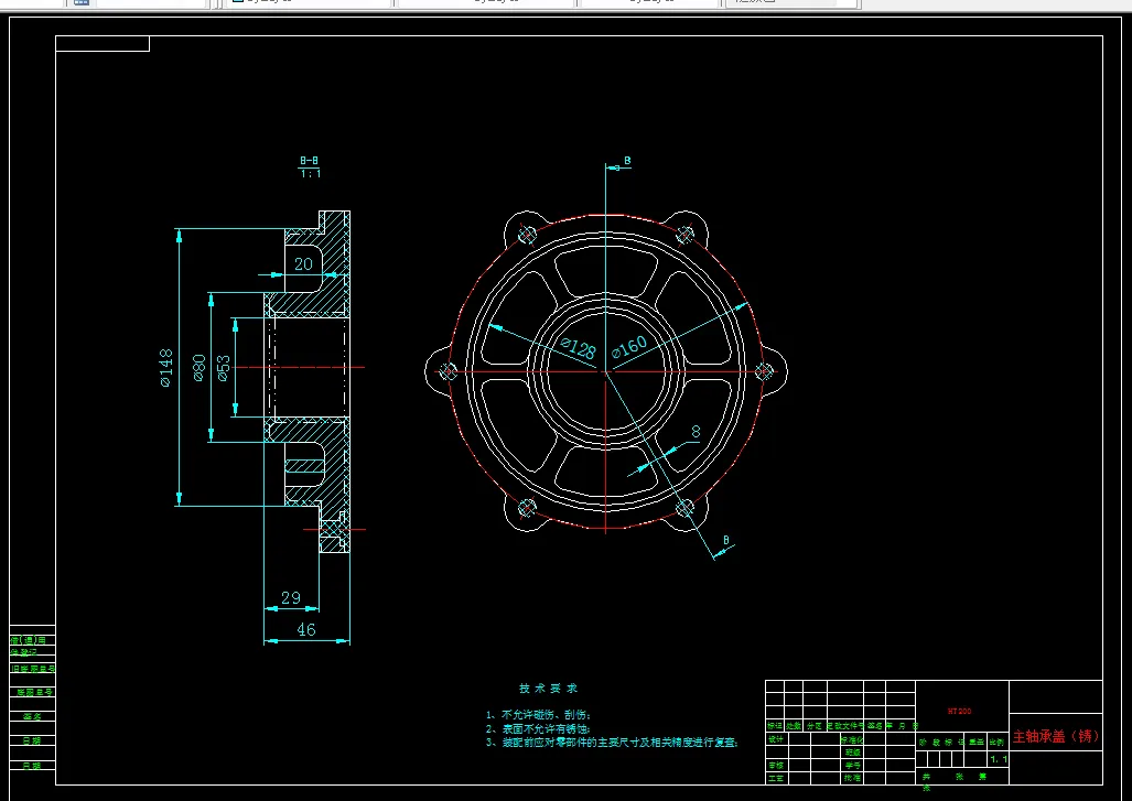 主轴承盖零件加工工艺及钻床夹具设计是包括零件加工的工艺设计、工序设计以及专用夹具的设计三部分。在工艺设计中要首先对零件进行分析,了解零件的工艺再设计出毛坯的结构,并选择好零件的加工基准,设计出零件的工艺路线;接着对零件各个工步的工序进行尺寸计算,关键是决定出各个工序的工艺装备及切削用量;然后进行专用夹具的设计,选择设计出夹具的各个组成部件,如定位元件、夹紧元件、引导元件、夹具体与机床的连接部件以及其它部件;计算出夹具定位时产生的定位误差,分析夹具结构的合理性与不足之处,并在以后设计中注意改进。