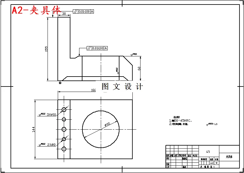 1.该零件为分度盘套,零件材料为HT200,强度较好,结构简单。 2.零件外形尺寸较小,钻2-9(锪14),钻孔切削力较小,夹紧力要求不高。 3.该零件前期各表面已完成加工,本工序孔径要求不高但加工位置尺寸精度有一定要求,设计夹具精度和复杂程度不宜太高,尽可能减低制造成本。 4.该零件为中批,本工序完成单一直径钻孔。