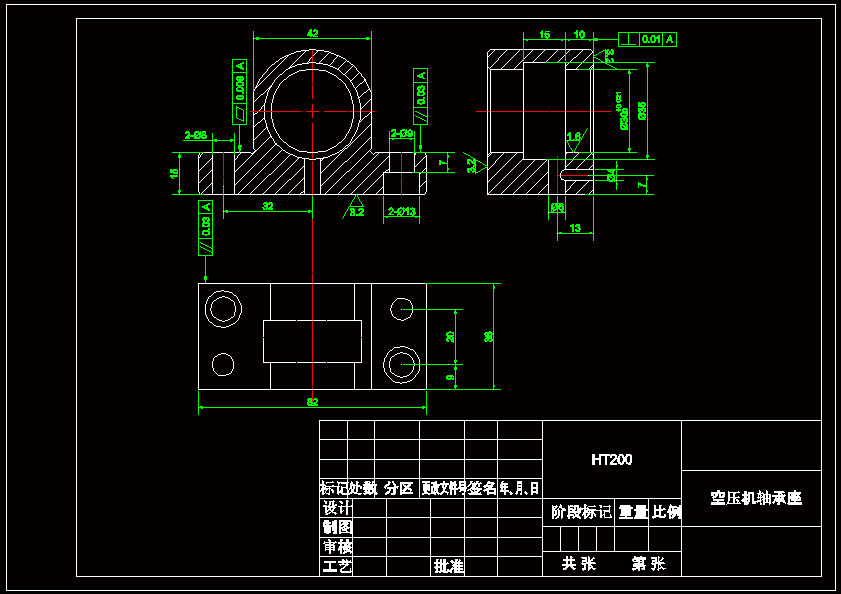 空压机轴承座加工工艺及夹具设计(镗30孔) 本次设计主要研究了空压机轴承座加工工艺和夹具的设计。首先,通过对轴承座的分析,了解轴承座的作用。其次,依据轴承座的毛坯件和生产纲领的要求及各个加工方案的比较,制定出切实可行的轴承座加工工艺路线。在运用机械制造技术基础等相关课程的知识,确定轴承座在加工中的定位、夹紧以及工艺路线安排,并确定了加工面的工艺尺寸的选择合适的机床和刀具,保证零件的加工质量。最后,根据被加工零件的加工要求,参考机床夹具设计手册及运用夹具设计方面的书籍的基本原理和方法,拟定夹具设计的方案,设计出高效、省力、经济合理并能保证加工质量的夹具。