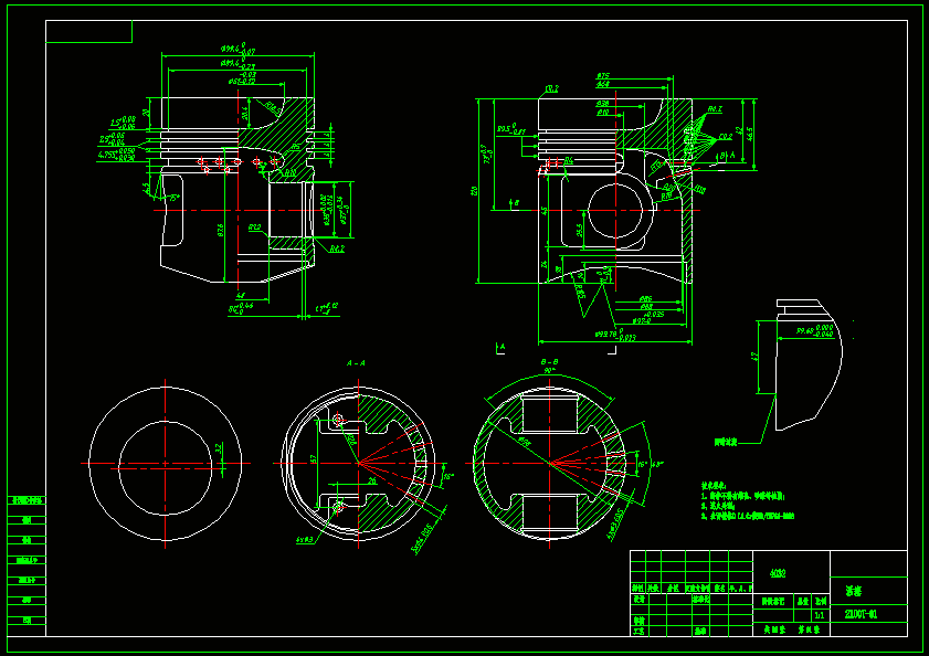 2100T柴油机活塞部件及工艺设计 2100T柴油机活塞加工工艺合理性是很重要的,通过对零件的作用及工艺方案分析,拟定毛坯的制造形式及工艺路线,通过分析、比较,采用了相对集中加工工艺方案,最终确定比较合理的机械加工工艺路线。制定工艺路线时主要考虑粗、精加工安排、加工方法选择、工序集中与分散、加工顺序等方面的要求。接着确定加工余量、工序尺寸,经过对工序特点的分析,恰当选择相应加工设备和工艺装备。接下来经过计算查表确定活塞各主要工序的切削用量并绘制工序卡片。