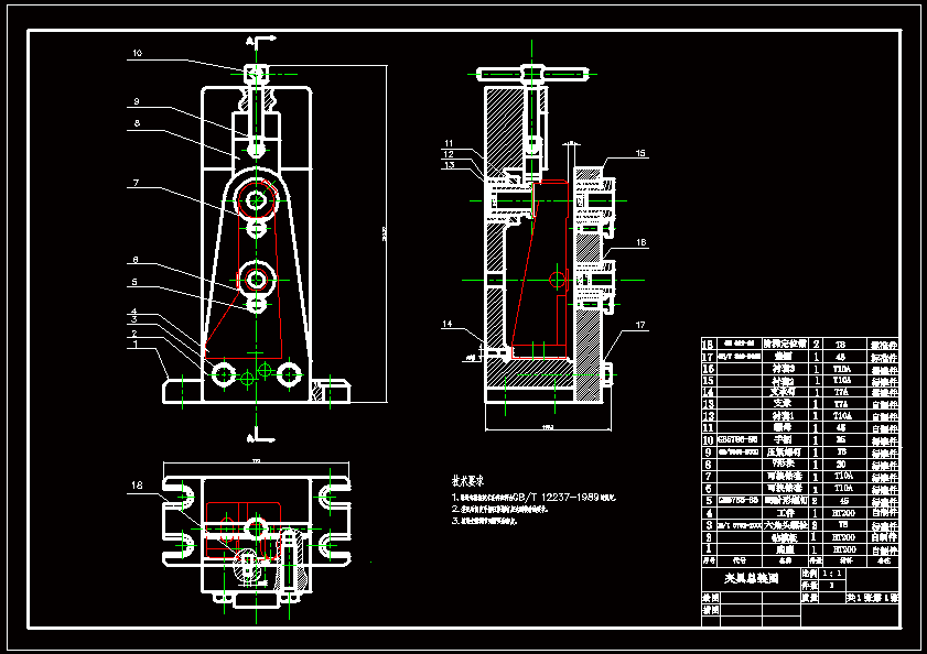 刹车支架加工工艺及钻孔夹具设计 卧式钻:左侧面定位控制3个自由度(俯视图),右侧V型块定位控制2个自由度、并夹紧,后方使用支撑钉定位、控制1个自由度。夹紧面选择直径16mm的孔外圆夹紧,可以保证在夹紧过程中不影响零件形状,刚性较好