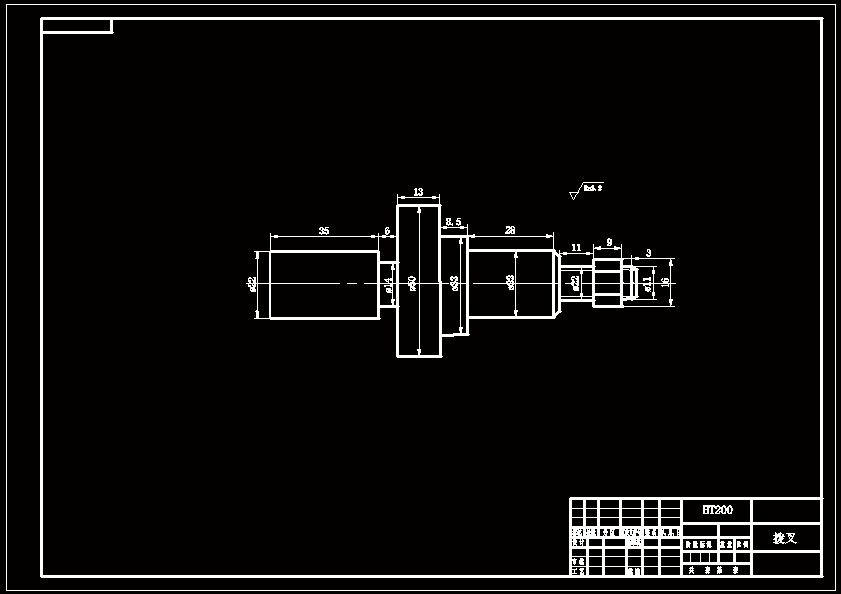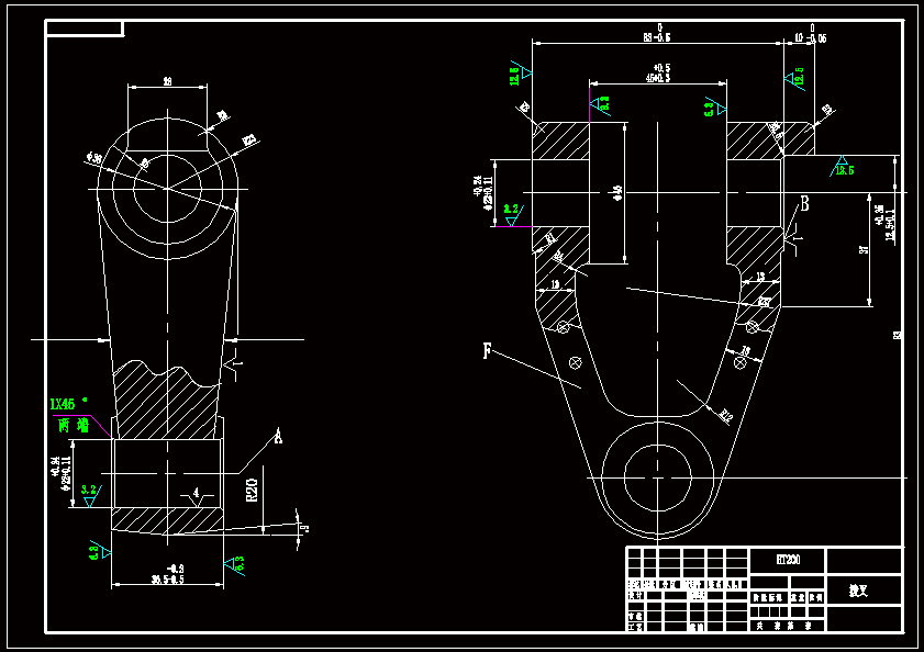 连接叉铣叉口夹具设计本课题主要是设计连接叉(如图1-1)铣叉口夹具,要求加工叉口两平面A面C面以及左侧面D面,并且是批量生产。基于这样的要求,首先分析零件,确定定位方案。虽然零件形状不规则,但是有一通孔,根据基准统一的原则选择22孔和两面(B面和F面)进行定位,其中22孔限制零件的四个自由度,B面和F面各限制一个自由度,这样零件被完全定位。由于要求多件加工,并且要求在本工序中铣削三个平面,所以决定采用前一排与后一排的零件对称分布,前一列与后一列相同分布的方式来放置零件(具体放置方式见第四章图4-3)。本设计采用四件加工的布置方案。这样在本工序中一次性便可加工出十二个平面,大大提高了生产效率。