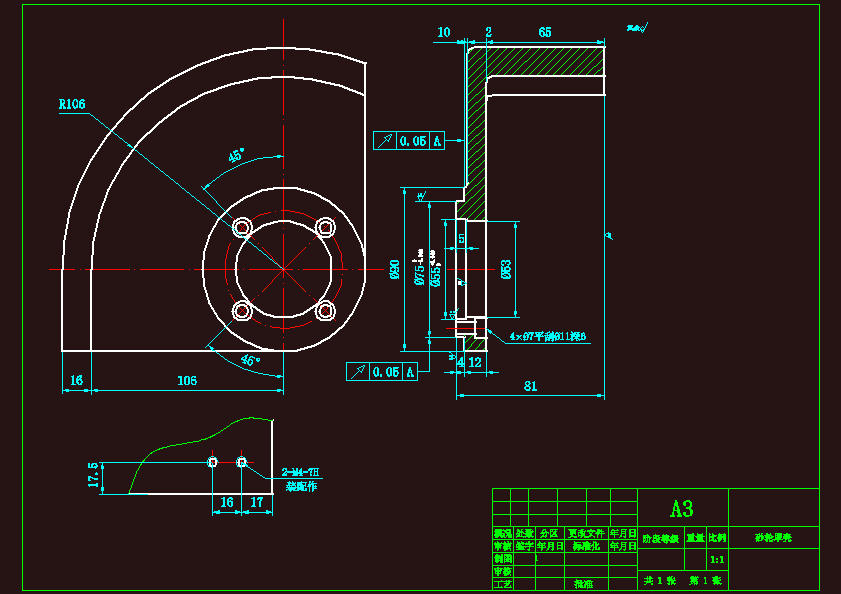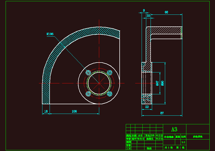 M9116A模具工具磨床30-108A砂轮罩壳工艺规程编制及钻4孔专用夹具设计本设计是对砂轮罩壳零件加工应用及加工的工艺性分析,主要包括对零件图的分析、毛坯的选择、零件的装夹、工艺路线的制订、刀具的选择、切削用量的确定、加工工艺文件的填写。选择正确的加工方法,设计合理的加工工艺过程。此外还对零件的某道工序的加工设计了专用夹具.