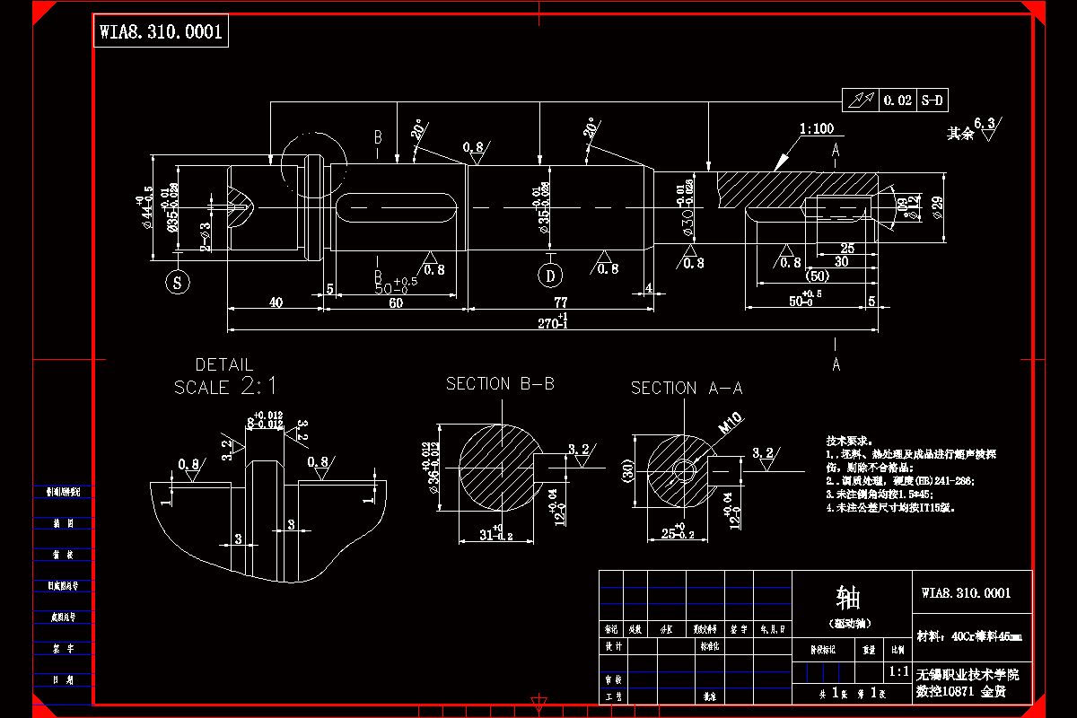 WIA8.310.0001驱动轴工艺及铣键槽夹具设计 WIA8.310.0001驱动轴是用在直齿减速箱上的主动轴,属于阶梯轴。轴类零件是机器中经常遇到的典型零件之一。它在机械中主要用于支承齿轮、带轮、凸轮以及连杆等传动件,以传递扭矩,并保证装在轴上零件的回转精度。 本次课题主要是通过对WIA8.310.0001驱动轴进行相关工艺分析,从而制定出切实可行的加工工艺路线,并完成一份WIA8.310.0001驱动轴的二维CAD图的绘制;通过对驱动轴机械加工工艺路线的制定,完成相关的工艺过程卡及工序卡各一份;并完成驱动轴铣键槽专用夹具的设计,绘制一份铣键槽专用夹具的总装图;最终完成WIA8.310.0001驱动轴相关课程设计说明书