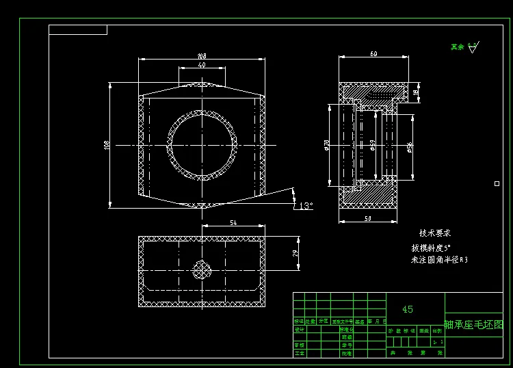 轴承座零件加工工艺及镗孔夹具设计是包括零件加工的工艺设计、工序设计以及专用夹具的设计三部分。在工艺设计中要首先对零件进行分析,了解零件的工艺再设计出毛坯的结构,并选择好零件的加工基准,设计出零件的工艺路线;接着对零件各个工步的工序进行尺寸计算,关键是决定出各个工序的工艺装备及切削用量。
