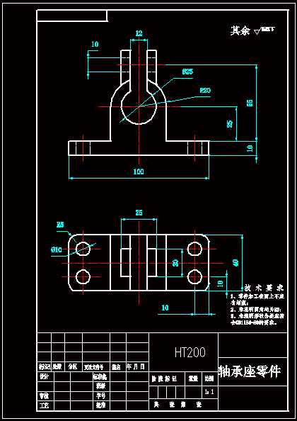 轴承座零件加工工艺及夹具设计是包括零件加工的工艺设计、工序设计以及专用夹具的设计三部分。在工艺设计中要首先对零件进行分析,了解零件的工艺再设计出毛坯的结构,并选择好零件的加工基准,设计出零件的工艺路线;接着对零件各个工步的工序进行尺寸计算,关键是决定出各个工序的工艺装备及切削用量;然后进行专用夹具的设计,选择设计出夹具的各个组成部件,如定位元件、夹紧元件、引导元件、夹具体与机床的连接部件以及其它部件;计算出夹具定位时产生的定位误差,分析夹具结构的合理性与不足之处,并在以后设计中注意改进。