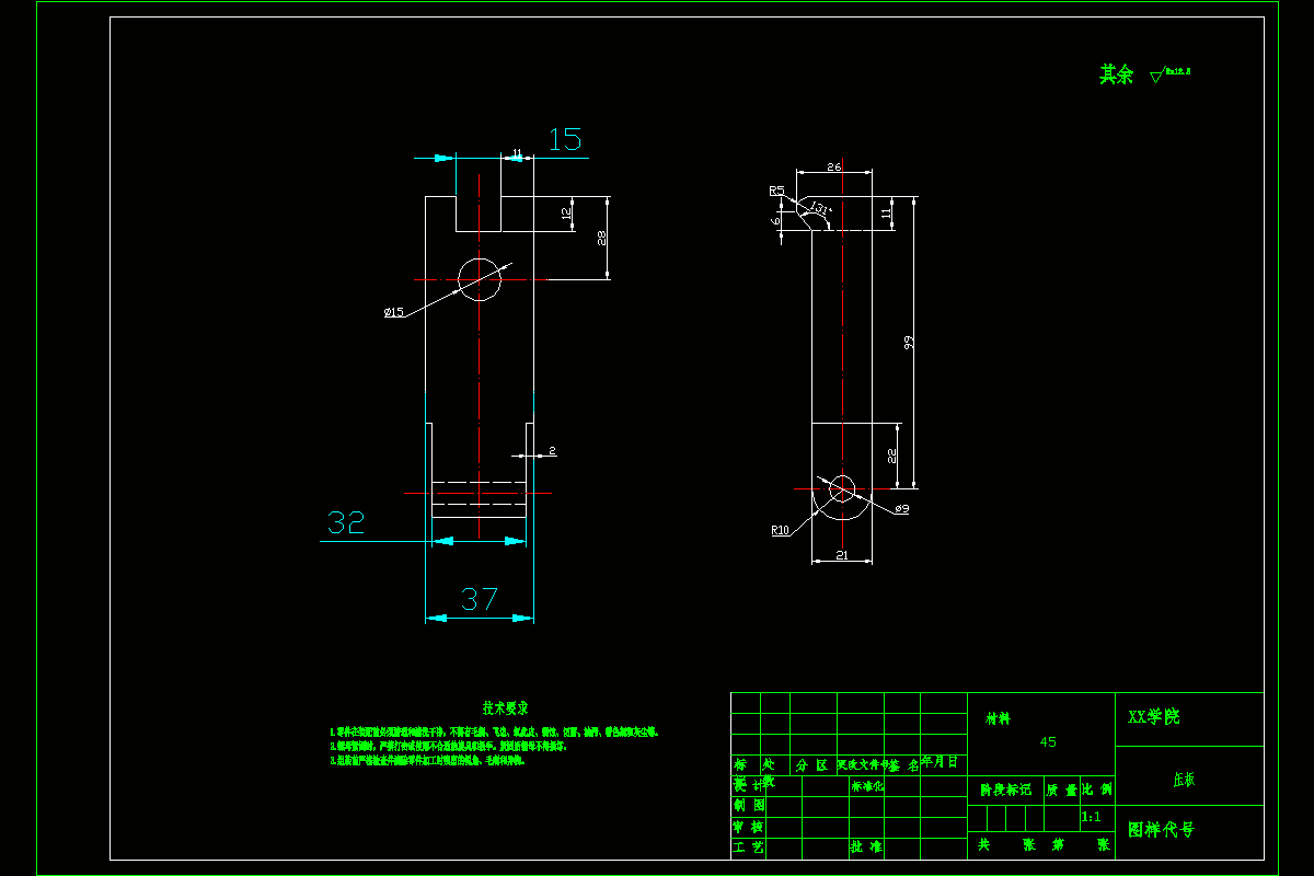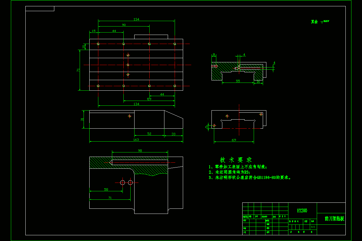 本课题来源于车床前刀架拖板零件的生产制造。本课题要求对车床前刀架拖板零件进行合理的工艺规程设计,包括零件每一道工序的选用设备、切削刀具、切削用量、定位方式等,并要求绘出工序图。另外要求对车床前刀架拖板工艺规程设计及翻转式钻摸进行夹具设计。其目的是把所学的机械制造工艺,金属切削原理及工艺装备设计基础知识与计算机辅助设计方法结合起来,加强理论知识并锻炼实践和动手的能力。为培养学生独立的分析问题和解决问题的能力打下良好的基础。 在课题的研究设计阶段,针对该零件的结构特点,制定加工工艺;深入理解了夹具的相关知识,结合零件的结构特点选择需要的夹具元件,设计出夹具的整体结构