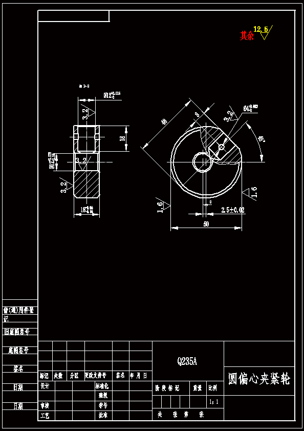 本文是对圆偏心夹紧轮零件加工应用及加工的工艺性分析,主要包括对零件图的分析、毛坯的选择、零件的装夹、工艺路线的制订、刀具的选择、切削用量的确定、加工工艺文件的填写。选择正确的加工方法,设计合理的加工工艺过程。此外还对圆偏心夹紧轮零件的两道工序的加工设计了专用夹具. 机床夹具的种类很多,其中,使用范围最广的通用夹具,规格尺寸多已标准化,并且有专业的工厂进行生产。而广泛用于批量生产,专为某工件加工工序服务的专用夹具,则需要各制造厂根据工件加工工艺自行设计制造。本说明书夹具设计的主要内容是设计圆偏心夹紧轮内孔端面铣床夹具和压盖安装孔钻床夹具设计。