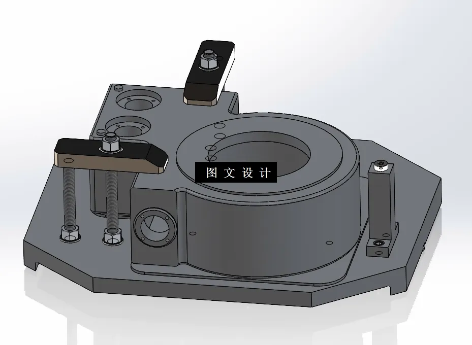 减速箱体工艺及铣上表面夹具设计 本夹具主要用来铣上表面保证距离E面,我们将着力解决工件的装卸上和保证加工精度要求上。 本次夹具设计的铣铣上表面保证距离E面,采用两销一面定位方式,底面与零件接触,限制z移动,x转动,y转动;自制φ303短销限制x移动,y移动;菱形销限制z转动。这样空间的6个自由度都已经限制完了
