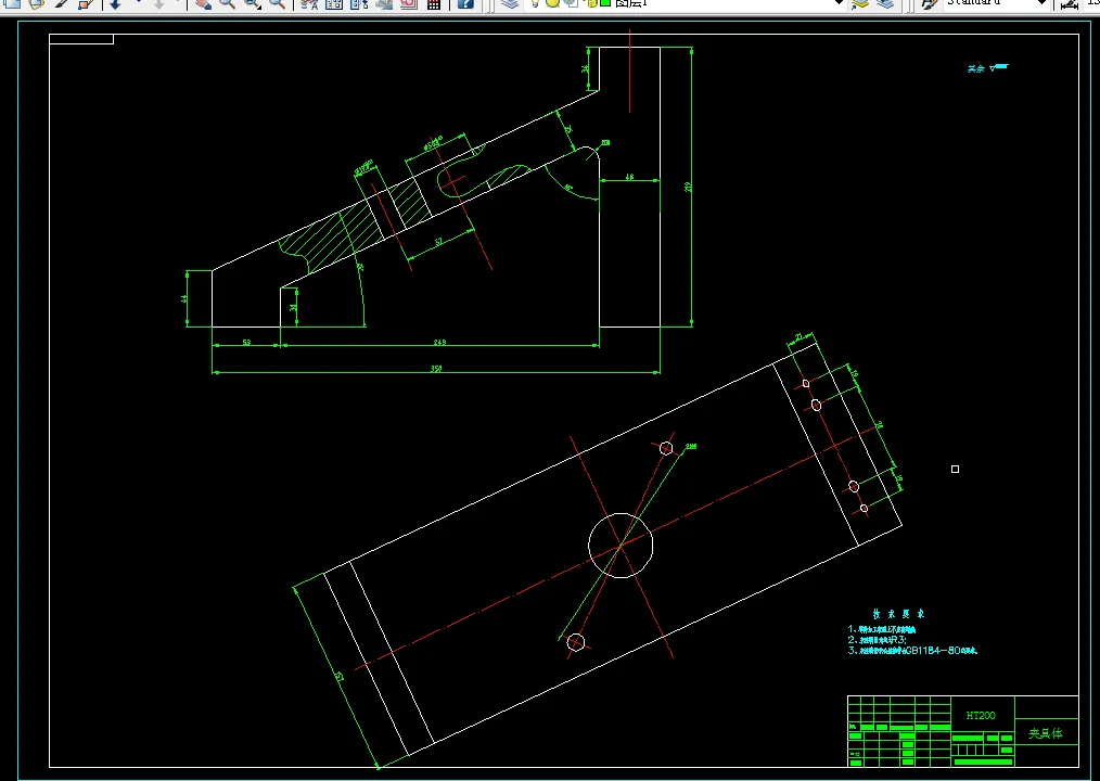 托架零件加工工艺及钻斜孔夹具设计是本次论文制作的内容。工艺和夹具两者的设计是本次毕设的主要内容。围绕着这两点进行展开制作。首要是对托架零件的结构分析和工艺方面分析。然后根据托架零件的结构以及形状进行工艺规程设计。工艺规程中确定每一个加工表面的加工方案。选择加工的定位基准。工艺中的工序加工余量的确定。工序的加工设备和刀具、量具等的合理挑选。通过查阅计算工序中的切削用量以及加工基本工时。最后,进行专用夹具的设计。设计的夹具要满足托架加工的技术要求,而且要制作一个合理的专用夹具,包括夹具的设计结构方面。要做到结构简单,便于操作。使得设计的夹具能够满足批量生产托架零件。在整个设计过程中包括了其他的制图、制表、文字编写、排版等设计。