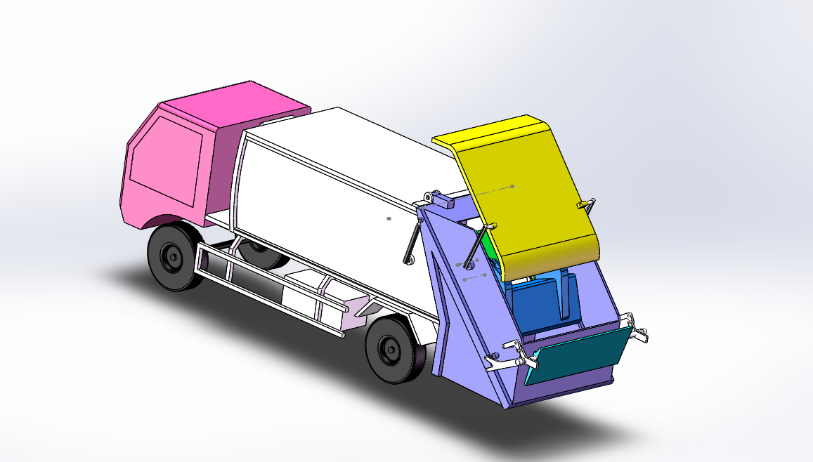 整车各机构零部件及整车的结构设计使用 SOLIDWORKS 进行零件的三维建模及运动机构的装配,并使用 SOLIDWORKS 对车厢、刮板、滑板进行有限元分析,保证了结构的性能并降低了生产成本。