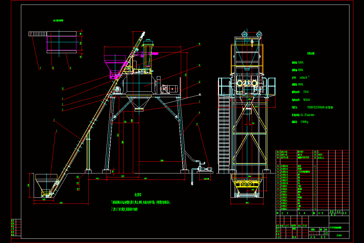 JS1000主要组成结构包括:搅拌装置、传动系统、上料系统、卸料系统、机架、电气控制系统、润滑系统等。这些系统之间的连接要求紧凑,工作可靠。本次设计主要是对搅拌装置、传动系统、上料系统以及卸料系统的设计,主要包括:搅拌装置方案的确定、搅拌轴的设计计算、传动系统的设计计算、轴承的校核、上料系统的设计以及液压卸料系统的设计,最后完成搅拌机总成图及零部件图。