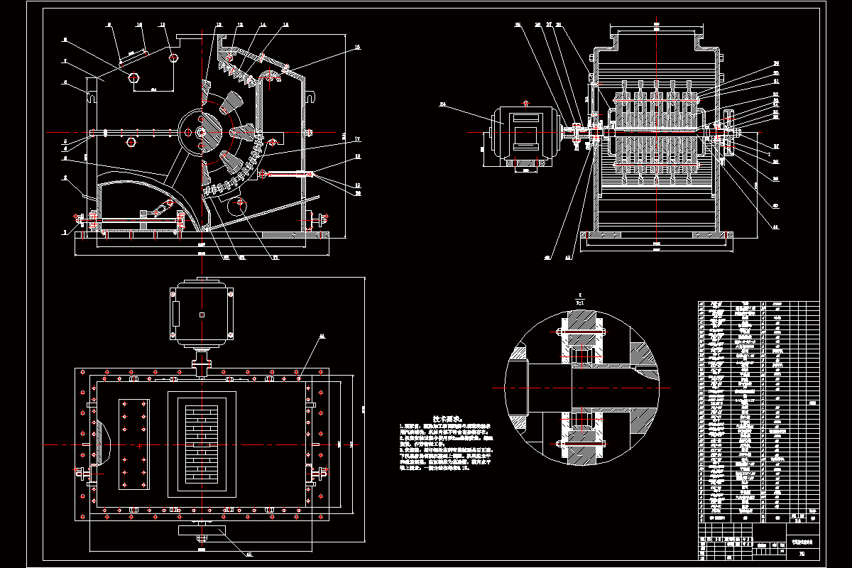 在本次设计中,从锤式破碎机类型的确定、调节方案的设计选择和传动方案的选择进行论证,确定了最终的设计方案,继而对尺寸设计计算、工作参数的设计计算、主轴的设计计算及校核、轴承的选择及校核、键的选择及校核、飞轮的设计计算和调整装置的设计,通过以上设计达到锤式破碎机的工作要求。