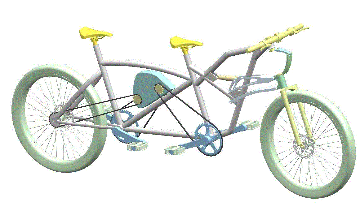 基于传统双人自行车进行的创新设计。在设计时依据人体工学进行了车身造型,采用同类型对比法进行了结构的改进设计,使用有限元分析的方法对主要受力部件进行了静力学分析,并采用行星轮增速机构使该双人自行车的速度有较大的提升。本次设计的主要内容包括以下几点: