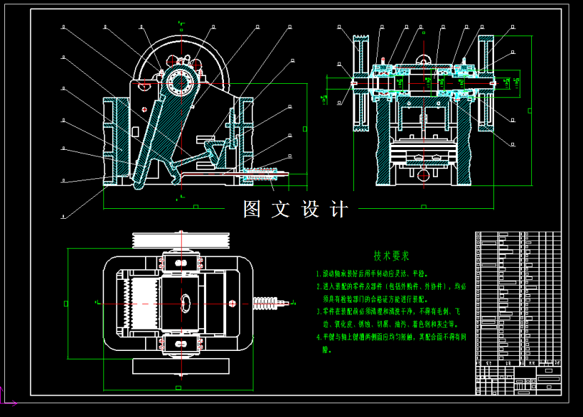 在本文的设计上,主要设计的是颚式破碎机的工作装置,其工作的基本结构形式是在传动下实现动鄂的运动,和定鄂在相互挤压的过程中对矿石进行破碎的过程。颚式破碎机因为在结构上,动鄂的机件在动力的带动下实现复杂的工作过程,使得动鄂上的运动的轨迹处于一个封闭的曲线形式。在疏导偏心轴的负载的工作下,达到最大的破碎比可以达到10倍以上。在本文的设计上,通过对颚式破碎机的结构进行分析,完成工作机构的总体结构设计,对传动的动鄂结构形式进行设计,定鄂结构尺寸的设计,传动辊轴结构设计和计算,对主轴的转速进及钳角进行设计计算,完成对最大破碎力的计算和主要零件的受力上的计算。选择合适的传动轴承和滚动元件。从生产的角度上提高颚式破碎机的工作效率,改善工作过程中的传动稳定性,提高生产的能力和结构的先进性要求,使得颚式破碎机在市场上占有更加广泛的使用前景。