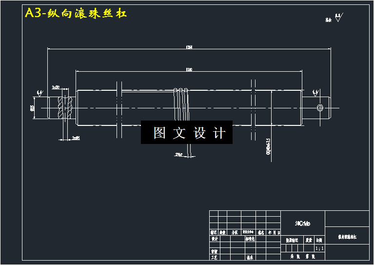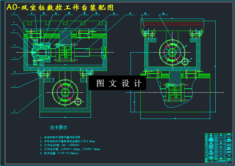 技术数据:工作台长×宽(mm):420×330,工作台重量(N):3500,行程(mm):ΔX=60-100;ΔY=50-80,脉冲当量:0.05-0.08mm/p。技术要求 (1)工作台进给运动采用滚珠丝杠螺旋结构 (2)滚珠丝杠支撑方式:双锥-简支型 (3)驱动电机为反应式步进电机 (4)步进电机与滚珠丝杠间采用齿轮降速要求消除齿轮间隙