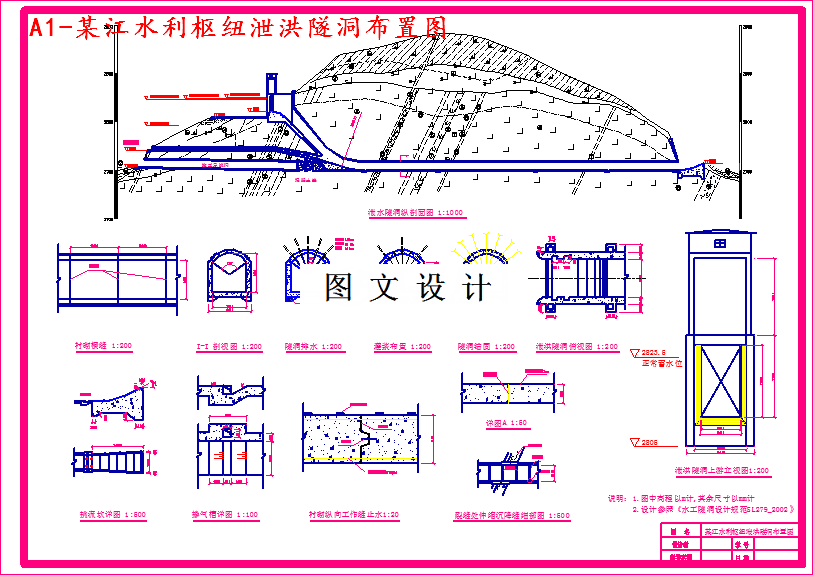本设计题目是粘土心墙土石坝设计与枢纽布置方案比较,根据《碾压式土石坝设计规范SL274-2001》与《水工隧洞设计规范SL279-2002》编写。首先,在对设计指导书提供的的地理气候特征,工程水文地质等资料分析的基础上,通过多个调洪方案比较,确定泄洪方式和拟定泄洪建筑物的孔口尺寸,并得到设计水位、校核水位及其相应流量。然后选择主要建筑物型式选择和水利枢纽布置。主要包括:确定枢纽组成建筑物及其设计等级,通过不同方案的初步技术比较,选定坝型。通过定性分析比较,选定其他建筑物型式。确定挡水建筑物、泄水建筑物和水电站建筑物的布置方案。其次,进行大坝设计。通过在土石坝中对几种不同类型的土石坝进行技术经济等方面的比较,最终确定大坝为心墙土石坝。并确定大坝的基本剖面及轮廓尺寸。对坝体排水及坝坡,粘土防渗墙进行防渗设计。坝址附近有粘土料场及沙砾料场,通过计算确定粘土料场及沙砾料场的选用。在坝体的渗流计算中,本设计分别选用坝体中间典型剖面的三种工况进行设计,计算渗透流量及溢出水深。并画流网图,验算渗流溢出点的渗透坡降。土石坝易于发生滑动失稳。故要对其稳定性进行计算。确定在各种水位工况下上下游坝坡的最小安全系数,并经过反复计算得到大坝经济剖面。土石坝坝基处理是分析河床部分及坝肩,选择适宜的渗流控制方案。在大坝的细部构造上,分别设计坝防渗体及排水设备,并对防渗体及排水部位进行反滤层设计。