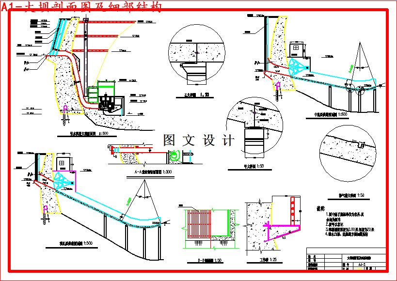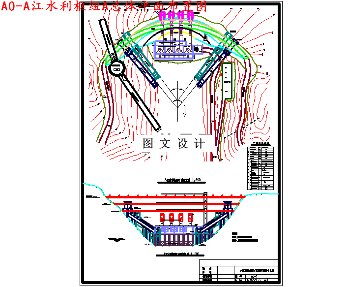 A江水利枢纽同时兼有防洪,发电,灌溉,渔业等综合作用,水库正常蓄水位184m,设计洪水位187m,校核洪水位190.2m,汛前限制水位182m,死水位164m,尾水位103.5m。A江水利枢纽工程等别为一等,工程规模为大(1)型工程,主要建筑物级别为1级,次要建筑物级别为3级,临时性建筑物级别为4级。A江水利枢纽的主要组成建筑物有挡水建筑物,主副厂房,泄水建筑物,过木筏道等。挡水建筑物是一变圆心变外半径的双曲拱坝,最大坝高101m,坝底厚25m,坝顶宽8.3m。泄水建筑物由两个浅孔和两个中孔组成:浅孔位于两岸,孔口尺寸为8.5×8,进口底高程为165米,出口底高程为155米;中孔位于水电站进水口两侧,孔口尺寸为7.5×7.5,进口底高程为135米,出口底高程为130米。在坝身泄水孔的上下游侧分别布置检修闸门和工作闸门,检修闸门采用平板门,工作闸门采用弧形闸门,在每一个工作闸门的上方有启闭机房,浅孔启闭机房高程为175m,中孔启闭机房高程为150m。泄槽支撑结构采用框架式结构。坎顶高程为119m,浅孔反弧半径为33m,中孔反弧半径为50m。泄槽直线段的坡度与孔身底部坡度一致, 挑射角浅孔θ=36中孔θ=20,导墙厚度为1.0m, 浅孔导墙高度为7m,中孔导墙高度为8.5 m。坝后式厂房装有4台5万kw的发电机组,主厂房长81m,宽18m,副厂房长66m,宽10m,安装场长21m,宽18m。压力管道的直径为5m。发电机层高程为114.8m,尾水管底高程为90.8m。为防止坝基渗漏,在坝基靠近上游侧进行帷幕灌浆,并且为了减少坝基的扬压力,在灌浆帷幕之后设置排水孔。为了防止混凝土产生裂缝,拱坝坝体设置横缝,横缝面上需设置键槽,以咬合加固,增强坝体的抗剪能力。当底宽在40~50m以上的拱坝,才考虑设置纵横缝,而本设计中,拱坝坝底宽为25.0m,小于40m,故可不设置纵缝。
