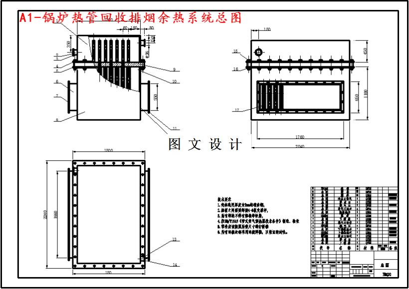 这次设计是通过热管式换热器来降低小型锅炉的排烟温度。热管作为一门新的技术,已经逐渐被广大的工程技术人员熟悉和重视。热管可用于航天、原子反应堆、电子器件、电器、电机、太阳能利用、轻工、化工等领域。热管自1964年首次由美国的洛斯阿拉莫斯科学实验室提出来后,对他的研究和应用发展的很快。特别是在我国号召节能减排,热管技术在工业锅炉、窑炉上节能的应用越来越多。本次设计使用的是重力热管,设计中对热管的阻力、传热量、需用应力都进行了校核,并取得了设计要求的效果。本次设计共分成六部分,第一第二部分主要介绍了换热器的种类和应用,后面几章主要介绍了热管换热器的设计和运用。