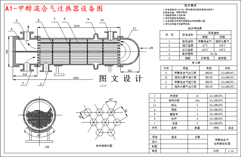 甲醛是重要的化工产品,主要生产方法、市场前景及发展趋势。本文主要承担过热器的设计。根据物料衡算和热量衡算结果,确定了过热器的工艺参数、类型及特征尺寸。并对过热器进行了流力学和热力学的衡算,结果表明所设计的过热器符合要求。甲醛通过泵打入蒸发器,经加热蒸发甲醇气体进入混合器,空气由罗茨风机送入空气预热器,经预热后进入混合器,并补充适量的水蒸汽进入混合器。当生产转入正常后,尾气系统用惰性气体将空气置换,然后由尾气风机循环部分尾气使之通过预热器后进入混合器。混合气体经过滤净化处理进入铺装电解银固定床的反应器。设定各项气体的比例来控制反应温度,原料气经氧化脱氢反应生成甲醛气体。最后经吸收塔吸收,通过塔顶加水来控制成品浓度,产品由塔采出.甲醇通过加热汽化为甲醇气体,控制系统按其氧醇比控制反应温度,使反应在最佳状态下进行。工艺上采用尾气循环法,将部分反应热量由循环气带走。而传统工艺路线是将反应热全部由配料蒸汽带走, 由于采用了尾气循环法, 这样就可能制取37%以上的不同浓度的工业甲醛,以满足不同下游产品的需要。