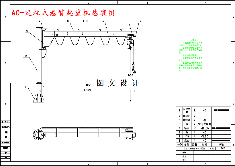 定柱式悬臂起重机主要部分有:固定立柱、旋转悬臂、旋转支撑装置、环链电动葫芦以及电气控制系统。立柱由无缝钢管制作,下端用法兰及地脚螺栓固定在基地上,上端装有旋转支承装置。环链电动葫芦作用是升降载荷并沿悬臂移动起到变幅的作用。定住式悬臂起重机立柱仅仅起支承作用。