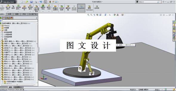 该只要求利用solidworks软件完成装置中各个零件的实体模型;完成零件的虚拟装配;利用solidworks相关插件完成机械手的运动仿真;设计要求机械手工作半径3000mm,最大高度2000mm,抓取物体的重量约5000N,最大抓取直径750mm。本设计介绍清理垃圾机械手的功能,介绍了机械手的设计方案、结构特点、设计过程和思路。设计过程中,对机械手液压缸做了部分设计计算。在机械手设计与研究的基础上,具体进行了机械手仿真动画设计、完成基于Solidworks的机械手运动动画仿真,利用仿真动画来描述其工作原理,设计结果表明该设计可大大提高设计效率,收到良好效果。