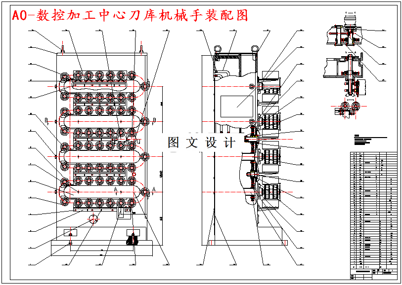 本设计介绍的是数控加工中心刀库与机械手研发与设计。加工中心它具有刀库和自动换刀装置,重点讲的是数控卧式镗铣床的换刀装置的总体设计,是用其中带有刀库式的自动换刀装置来进行分析的。它是多工序数控机床上应用最广泛的换刀装置,整个换刀的过程特别繁琐。第一步呢就是要把加工过程中需用的所有的刀具都安在一个比较合格的的刀柄上,在机床外进行尺寸的一个预调后,再按特定的方法装到刀库上去。在换刀时,要先在刀库中选择刀具,然后由机械手从刀库和主轴上取出刀具,再交换位置,把新的刀插到主轴,旧刀放回到刀库。放刀具的刀库有很大的的容量,它可以放六十把刀具,是采用链式结构,安装在机床的左侧刀库上。设计成由多环链式刀库和回转式双臂双手机械手组成。这个设计的主题就是刀具交换装置的结构设计、液压的控制。基于刀具数量、刀具直径、最大长度、最大重量的工具、工具存储空间、刀具运动线速度的可靠性,通过对存刀数、刀具最大直径、刀具最大长度、刀具最大重量、刀库安装空间、刀具最大运动线速度、刀库工作可靠性的要求以及所具有的条件的充分研究和分析,实现了刀具交换装置的总体方案的选择、总体结构设计、水力设计、以及轴、链轮、齿轮、支架、张紧装置、压盘、链板等部分结构设计、动态形式,电力传输,驱动器和运动控制类型的选择。使机构能够准确、快速、可靠地完成指定的运动。