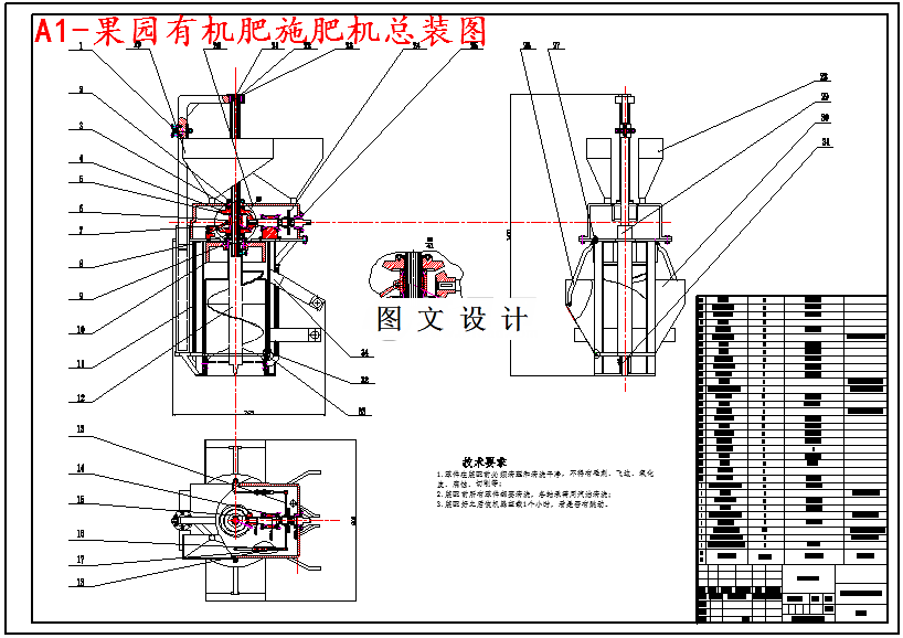 果树有机肥施肥机的结构由机架、传动系统、离合装置、集土装置、施肥装置、升降装置等组成。通过锥齿轮啮合将拖拉机输出轴的横向传动变为纵向传动,并改变其转速。控制升降装置中纵向安装的液压柱的伸缩使钻头产生上下移动,并带动连接在钻头顶部的挡土圆筒,使连接在挡土圆筒上的集土箱呈扇形结构张开或合拢,当钻头下降时集土箱张开集土。在钻头降到底部时触碰到装在底部的施肥开关(也是离合开关)使之打开,在施肥过程中,动力传动因离合器打开而停止,将锥齿轮换齿啮合改变钻头转向,施肥完毕后,开关关闭,钻头被提起反转上升,再次带动集土箱使之合拢完成覆土。将挖穴、集土、施肥、覆土一气呵成。