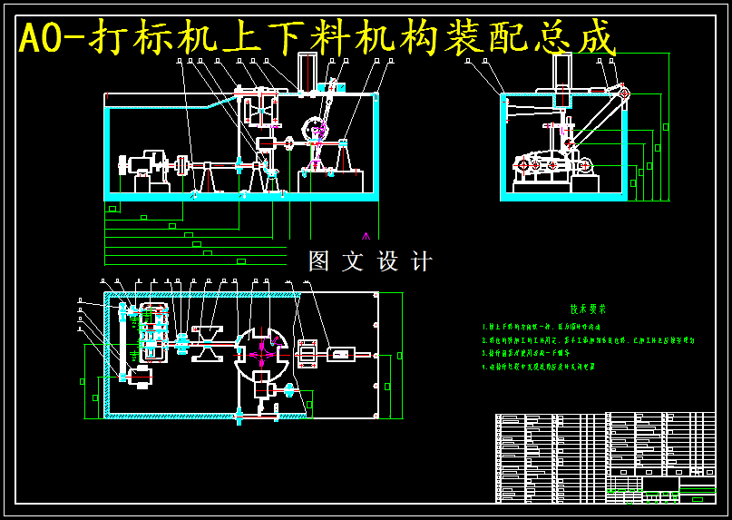本设计围绕着打标机自动上料和下料机构进行了深入的研究和设计,具体内容包括:上料机构采用了将物料预先放置在料仓中,通过摆动导杆机构,使导杆产生往复运动,来带动滑块将料仓中的物料重复不断地推入下一道工序;通过转盘来实现定位,推料滑块将物料推入转盘的物料槽中,并且通过槽轮机构使得转盘可以产生间歇运动,将送入的物料转送到打标工序的工位;打标完成后,再由转盘将物料转入下一个工位,通过物料自身重力的作用,使得完成打标的物料滑入卸料槽中,完成卸料动作。本次设计的上下料机构的结构比较简单,方便操作人员的操作,也能很好的节约成本。