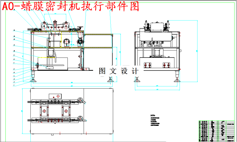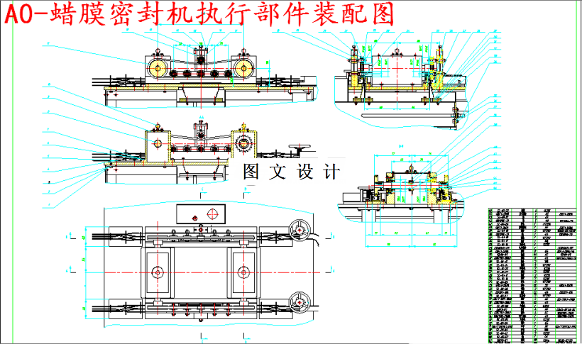 本设计对国内外包装机械的研究现状进行了综述,并详细分析了几种典型封口设备的工作原理和结构特点。本设计对包装机械的国内外研究现状进行了总结性阐述,并分析了不同封口设备的类型和特点。本设计对蜡膜密封机进行总体结构的功能性设计,将蜡膜密封机分为六个功能部件,分别为上料分瓶盘、拨瓶轮、放倒机构、封蜡机构、扶正机构和下料机构。本设计系统分析了各部分之间的运动关系,计算和分析了各部件的运动参数和传动零件几何尺寸并绘制了系统的传动链示意图。