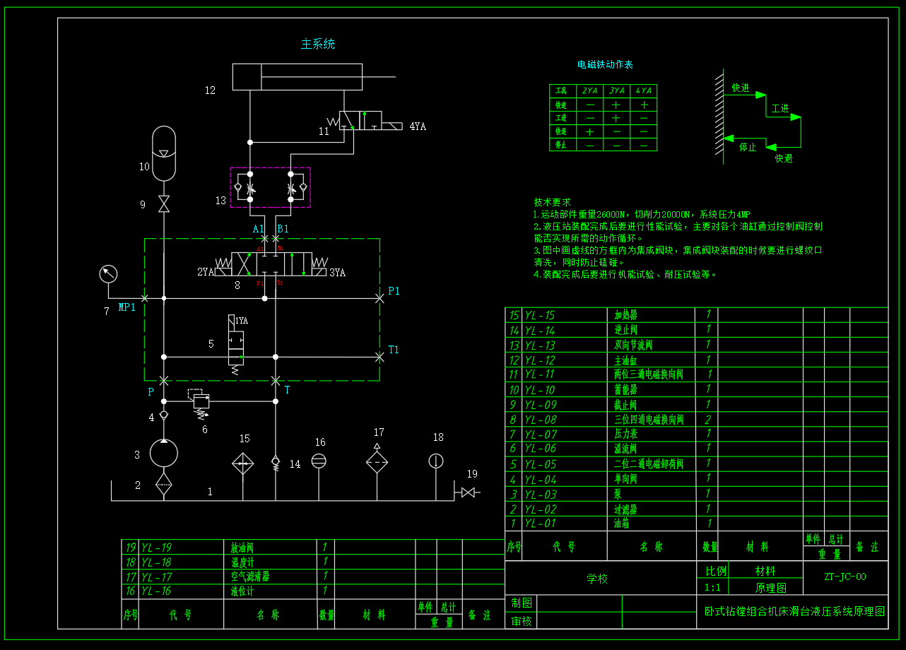 1.工作负载(切削力):20000N 运动部件重量:26000N 2.设置工作台快进、快退速度(5)m/min,负载(20)KN,加减速时间(0.1)s,快进行程(150)mm,压力损失(0.1)Mpa。工进行程(200)mm,速度(0.08-1.2)m/min。 3.设计液压系统动作循环。 设置:快进--工作进给--快退--停止的自动工作循环 4.采用(定量泵蓄能器增速 )作为液压动力源;系统压力减压作为夹紧液压力。使用背压为保证工进平稳。