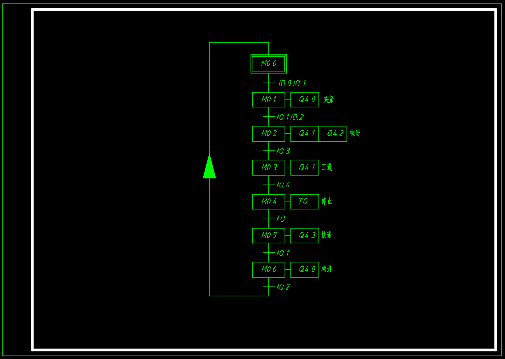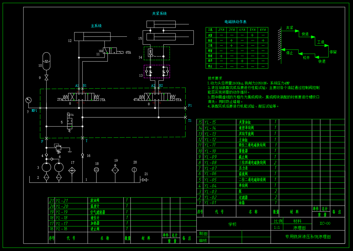 1.工作负载:20500N 自重:26000N 2.设置专机快进、快退速度(4.8)m/min,负载(20.5)KN,加减速时间(2)s,快进行程(400)mm,压力损失(0.3)Mpa。工进行程(20)mm,速度(8.4-17)mm/s,压力损失(0.3 )Mpa。夹紧力(20000)N。工作台行程(450)(200-800)mm。 3.设计液压系统动作循环。 设置夹紧--快进--工作进给--停留--快退--松开--停止的自动工作循环 4.采用(定量泵蓄能器增速 )作为液压动力源;系统压力减压作为夹紧液压力。使用背压为保证工进平稳。