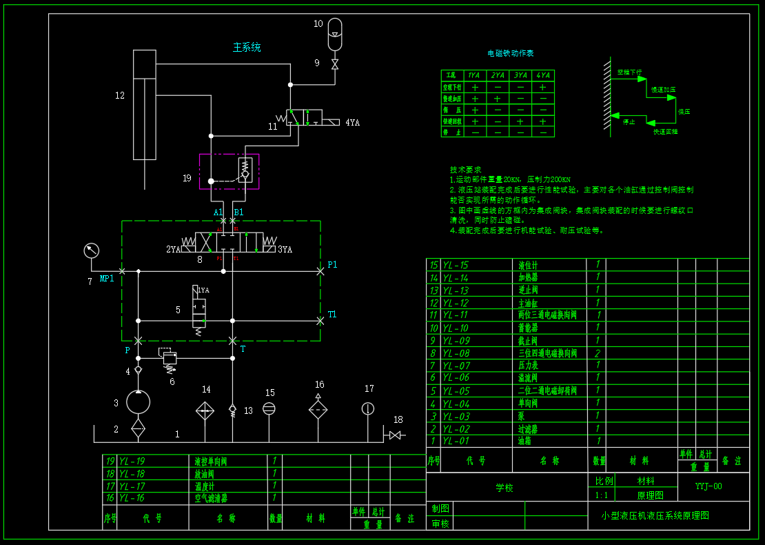 设置:空程下行--慢速加压给--保压--快速回程--停止的自动工作循环 1.工作负载(压制力):200KN 运动部件重量:20KN 2.设置工作台快进、快退速度(3)m/min,加压速度(40)mm/min,压制力(200)KN,加减速时间(0.2)s,快进行程(300)mm,压力损失(0.3)Mpa。工进行程(20)mm,加压速度(40)mm/min。 3.设置:空程下行--慢速加压给--保压--快速回程--停止的自动工作循环 4.采用(定量泵蓄能器增速 )作为液压动力源;系统压力减压作为夹紧液压力。使用背压为保证工进平稳。