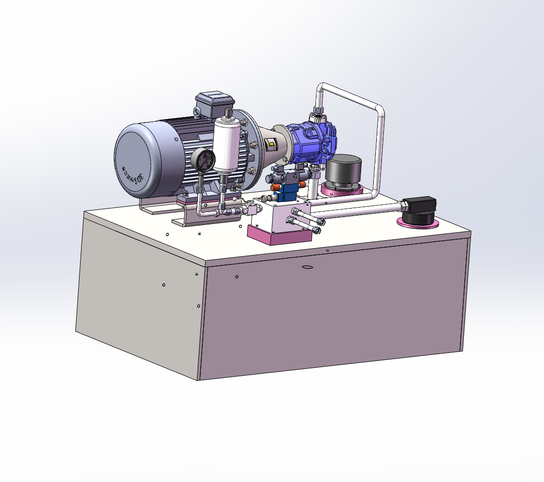 本文设计的是一种新型液压动力站液压系统的设计,包括了液压系统原理图的设计及绘制、液压系统参数的计算、液压元件的选型、能量损失验算、热平衡验算、油箱设计、集成块设计等。首先,确定整个回路的压力和流量要求,根据参数范围,进行计算选型液压泵,液压泵选型完成后根据液压泵的相关参数计算选型所需电机的功率,进行电机选型,然后在进行整个系统中其他元器件的选型。整个动力站液压系统由一个液压泵单独供油,实现了一定范围的压力油的供给,经过电机带动实现给系统供油,系统经过管路连接各液压元件,实现整个液压系统的功能。