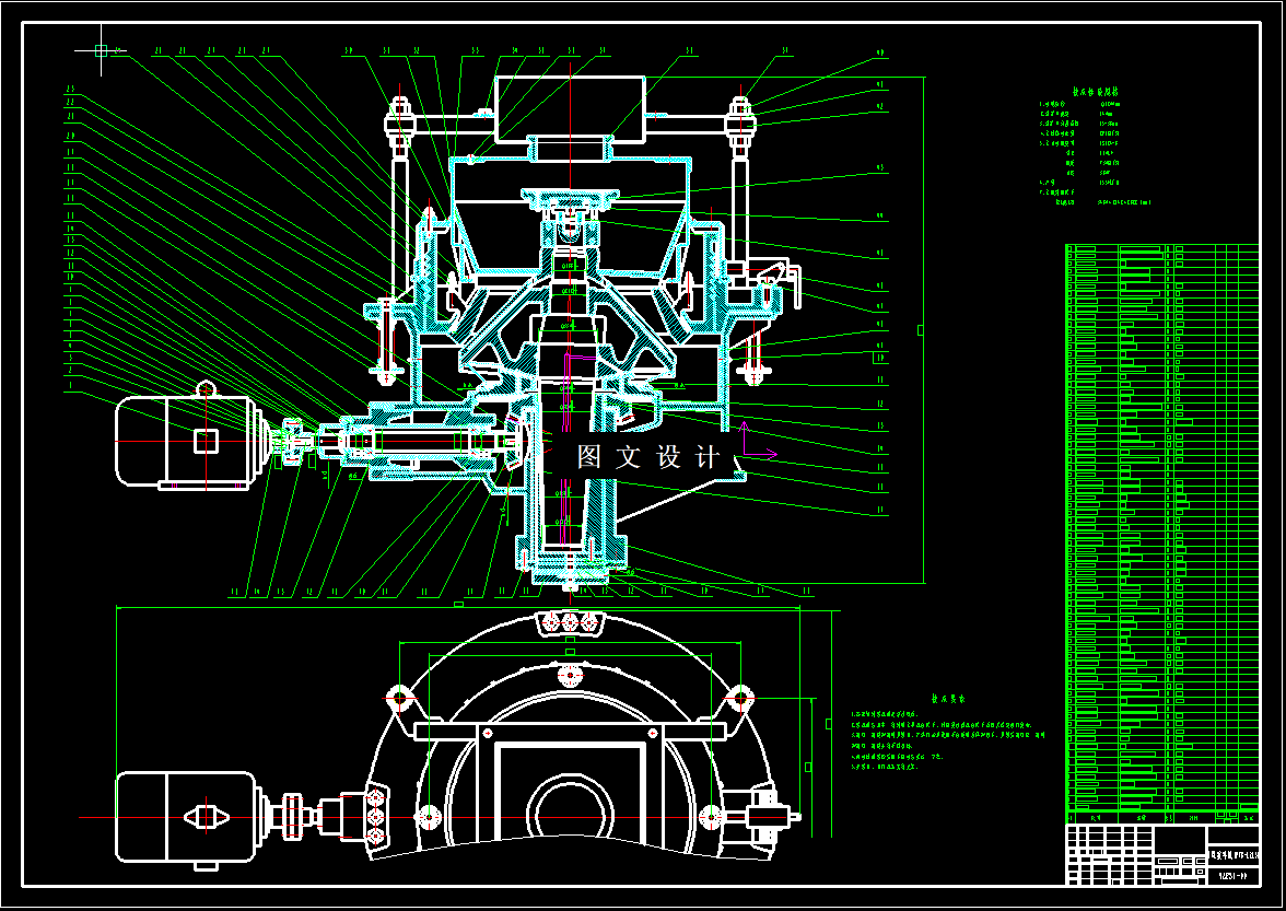 1、课题简介:对生产实际中提出的脆性材料的破碎课题,设计圆锥破碎机。学生需广泛查阅国内外有关脆性材料破碎的理论、破碎机械的性能结构等方面的资料,结合实际需要,对破碎壁大端直径1200 mm,最大进料尺寸130mm,出料尺寸15-38mm,处理能力大于100吨/小时的圆锥破碎机(PYB-1215)进行设计。 2、课题要求: 1)选题:查阅国内外有关脆性材料破碎的理论、破碎机械的性能结构等的有关资料,提出圆锥破碎机(PYB-1215)的设计方案。完成开题报告。 2)对圆锥破碎机(PYB-1215)结构参数进行优化设计 3)绘制圆锥破碎机(PYB-1215)总图、部分部件图、关键及典型零件图。 4)必要的性能、结构参数的确定和计算,一些零部件强度、刚度、稳定性的计算、校核