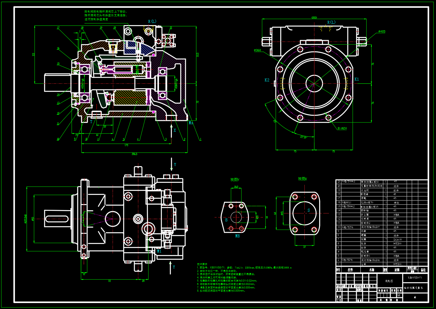 XB01VSO-71斜盘式轴向变量柱塞泵,包含二维CAD总装配图,配流盘,柱塞,包含设计计算书。 基本参数: 额定压力:35MPa 额定转速:n=2200r/min 额定排量:71mL/r 最大扭矩:395N.m 类型:XB01VSO-71系列斜盘式变量轴向柱塞泵