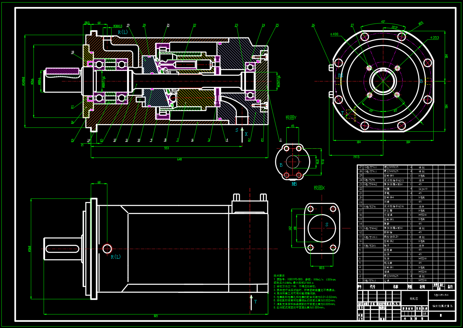 XB01FO-500轴向柱塞定量马达,包含二维图CAD总装配图,缸体,配流盘,柱塞,包含设计计算书。 基本参数: 额定压力:35MPa 额定转速:n=1320r/min 额定排量:500mL/r 最大扭矩:2785N.m 类型:XB01F0-500系列轴向柱塞定量马达