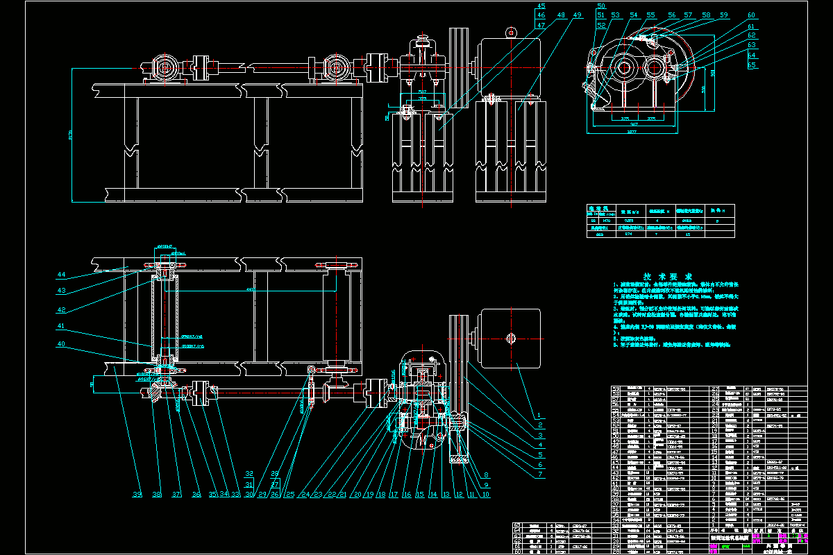 本次设计的主要内容有:传动方案的总体设计、电动机的选择、三角胶带传动设计、减速器的设计、联轴器的设计、锥齿轮传动设计及滚筒运输架等的设计。本次设计我采用了三角胶带传动,圆柱齿轮减速器及锥齿轮传动。