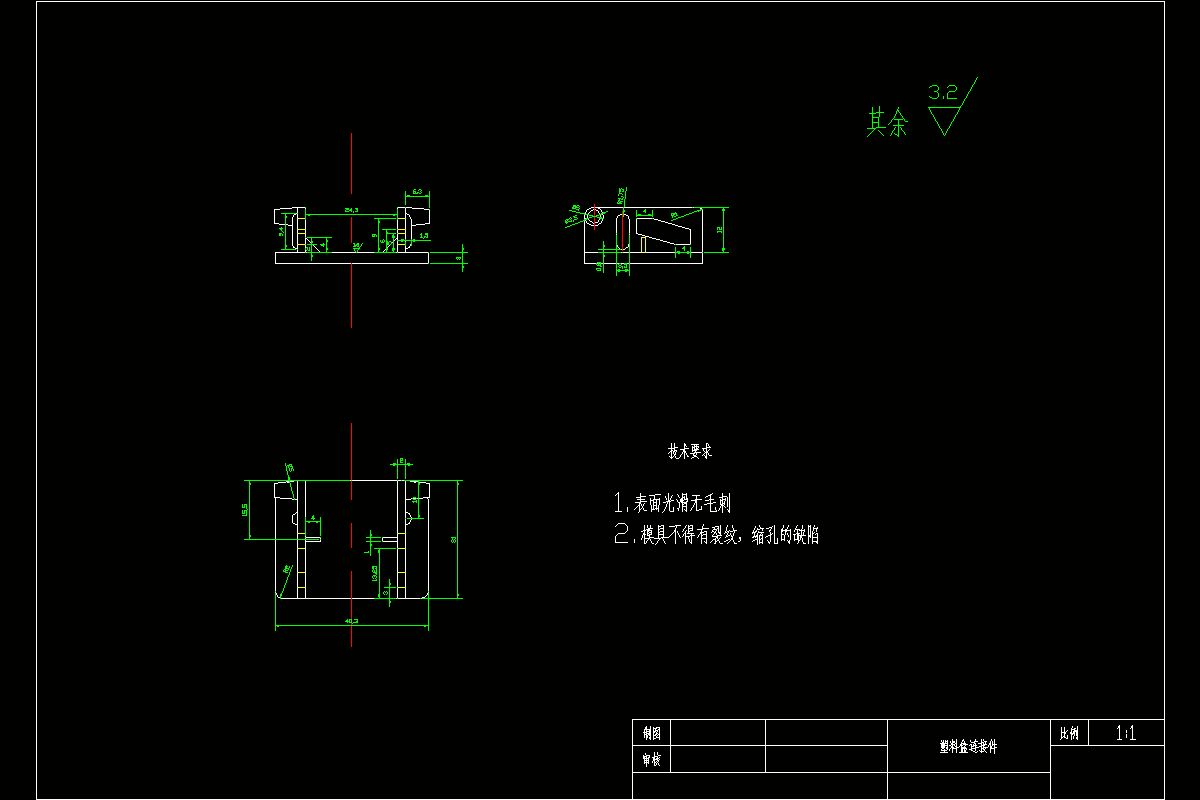 模具是制造业的基础工艺设备,被广泛应用于制造业的各个领域。在我国制造业不断发展的今天,模具制造显得越来越重要,社会对模具的需求和相关技术人员需求也越来越大。 本次的题目是塑料盒连接架模具设计,材料为ABS,该模具采用侧浇口一次分型实现浇道冷凝的自动填充,型芯采用镶拼式,采用斜导柱和抽芯机构成型构成塑件两侧轮廓,动模和定模两侧分别配以型芯、滑块、锁紧楔和定位销等机构,采用顶杆顶出塑件。本设计的模具结构合理,操作便捷,方案合理,经济适用。 关键词:注塑模;型芯;抽芯机构;定位销;顶杆