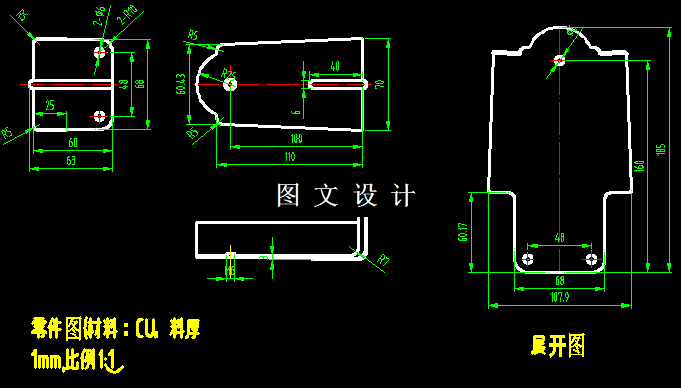 此零件,形状比较怪,看上是个L形弯曲件,侧面成U形结构,但是弯曲的部位,中间还有加强筋,还在这加强筋的深度很浅,因此对展开尺寸的计算,没有影响,计算展开尺寸后,工艺分析确定需要两套模具,落料冲孔复合模,还有成型模,本次设计针对落料冲孔工序,进行冲压模具设计,并计算模具刃口及外形的尺寸,绘制倒装复合模,选择中间导柱模架。