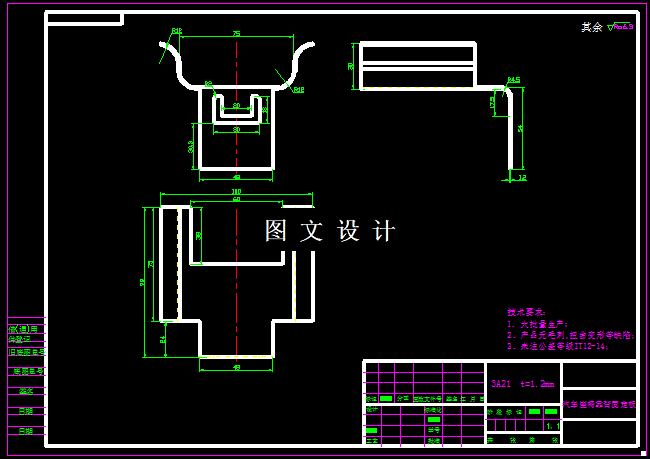 此零件为汽车座椅靠背固定板,零件出现多处弯曲,而且弯曲的方向还不一样,通过展开计算后发现,工件的底面还有个缺口,此处需要在弯曲之后冲裁,才能确保工件不变形,结合零件的形状分析后,确定排样结构图,设计双排结构,提高生产效率,然后计算模具尺寸,选择非标的矩形模架,绘制模具装配图和零件图,以及三维图。