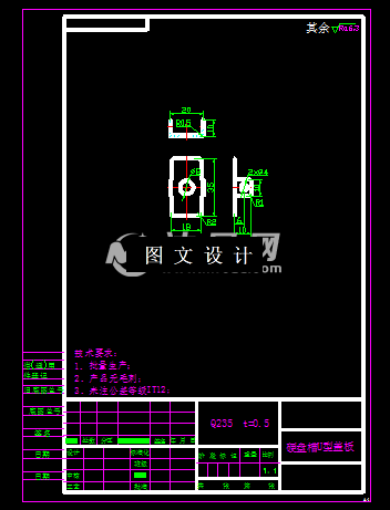 此零件是个用于机械盘的一个U型盖,零件整体成U形结构,因此其基本工序有落料,冲孔,弯曲,由于零件的外形尺寸比较小,因此结合工艺分析,确定选择设计多工位级进模,将弯曲部分设计成向下弯曲,中间平整部分,设计连接载体,通过切断载体的方式,工件脱离模具,所计算和设计出来的模具,比较容易理解,零件的合格率很高。