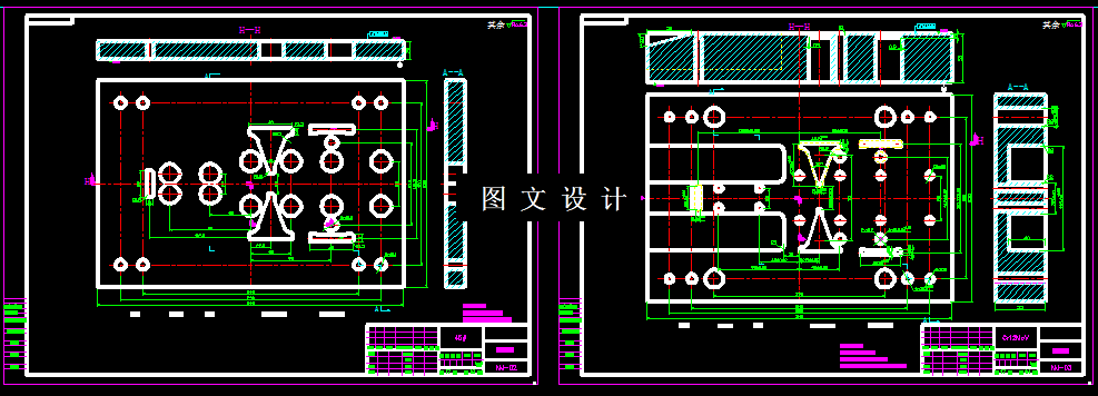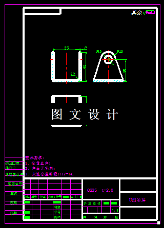 此零件是个吊耳零件,整体成U形结构,两侧采用圆弧过渡,圆形孔对称分布,结合生产需求,以及生产量的要求,分析工艺确定选择冲压级进模,通过计算工件的展开尺寸,绘制出展开图,并结合冲压工序,设计合理的排样图,并计算出模具的外形尺寸和刃口尺寸,设计正装结构的模具,绘制出模具装配图和零件图,计算模具所需要的冲压力的大小,选择合适的压力机。