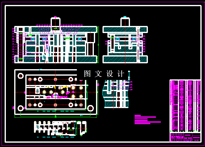 此芯片支架零件,是个多处弯曲的零件,通过对零件尺寸和形状的分析,冲压工艺的对比,确定采用多工位级进模生产,通过展开计算后,选择合适的搭边值,然后进行排样结构设计,最后计算模具的外形尺寸,选择矩形钢板模架,选择滑动导柱导套,绘制模具结构图和零件图,并计算所需要的压力,选择压力机。
