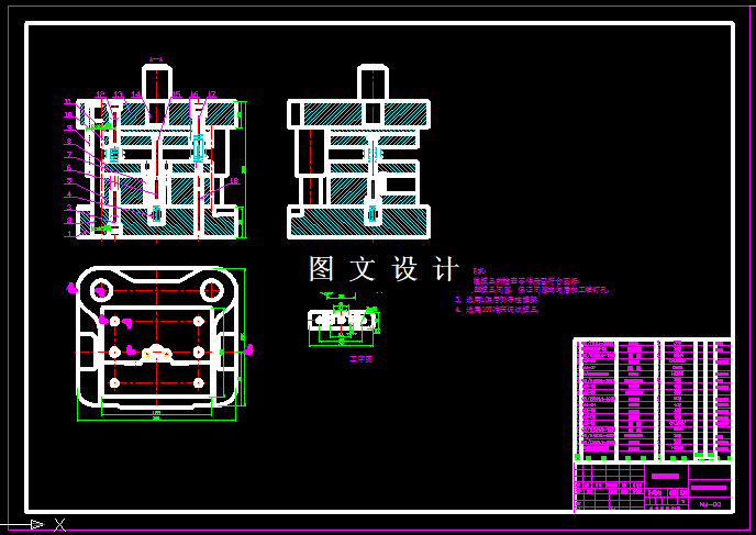 本次设计,是针对电视机垫片,进行工艺分析,选择合适的设计方案。零件的底面有弯曲,侧面还有单侧弯曲,侧面上还有翻孔,从工艺分析上看,落料和冲孔可以合并,底面和侧面的弯曲复合,侧面的翻孔单独设计一套,通过计算获得工件的展开尺寸,合理排样,设计排样图,结合工件的外形尺寸,计算出模具的外形尺寸,选择标准模架,绘制三套模具结构图和零件图。