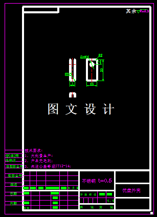 此零件是常用的U盘的保护外壳,由0.5mm厚的不锈钢材料生产而成,整体成U形,通过展开计算,得到工件的展开图,分析工序,确定采用落料冲孔复合模,和弯曲模,两套完成,设计排样图后,计算模具的刃口和外形尺寸,选择标准模架,并绘制两套模具的装配图和零件图,选择合适的压力机。